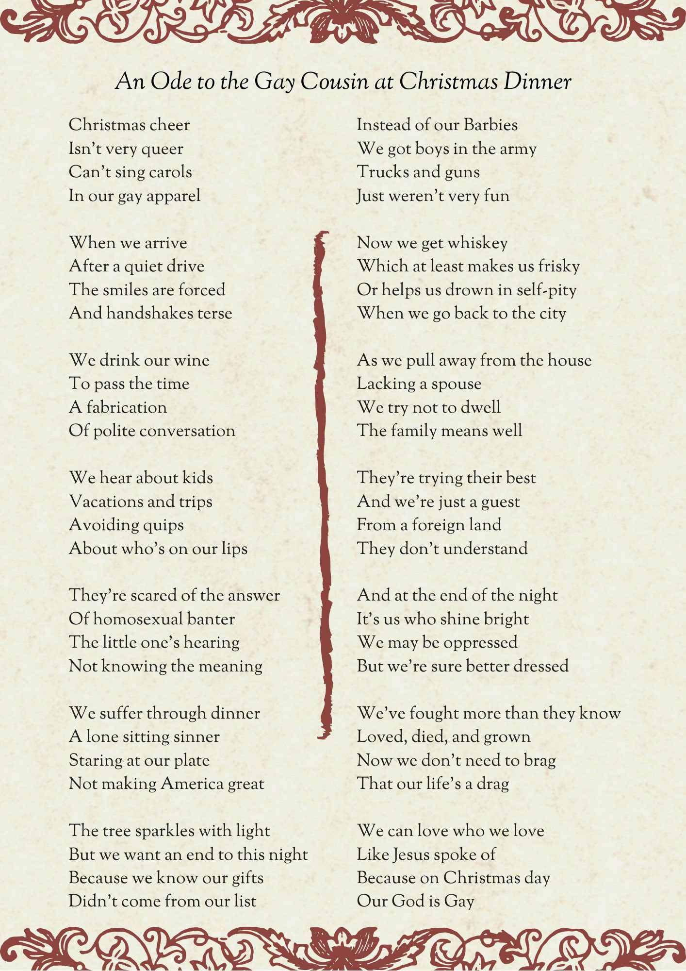 A Poem: An Ode to the Gay Cousin at Christmas Dinner